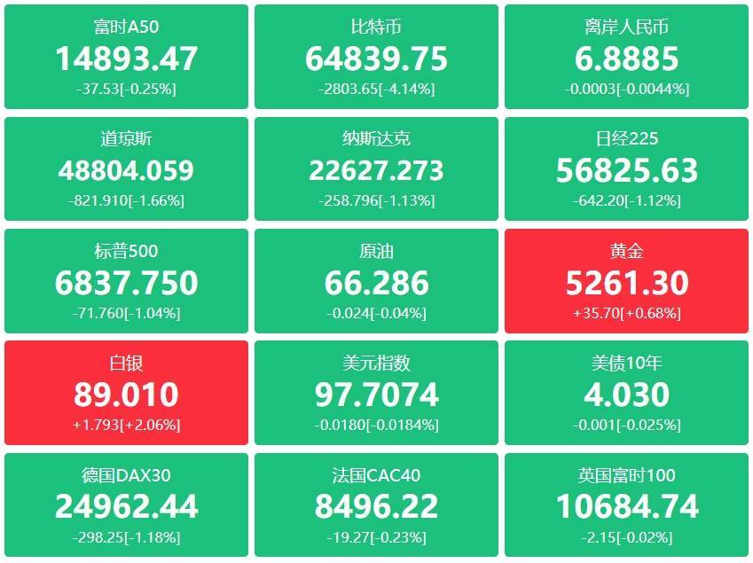 美股三大指数收盘均跌超1%,道指跌821点,跌幅达1.66%,纳指跌1.13%,标普500指数跌1.04%。大型科技股多数下跌,微软、奈飞跌超3%,特斯拉、亚马逊、Meta跌逾2%,谷歌、英特尔跌超1%;苹果、英伟达小幅上涨。纳斯达克中国金龙指数收跌0.92%。